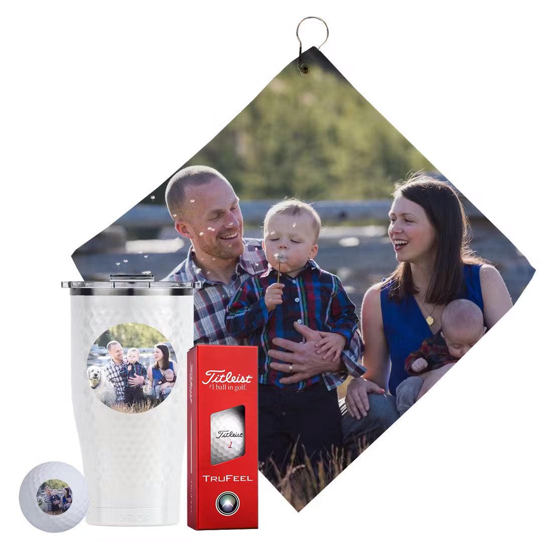 Not only does the 16”x16” microfiber golf towel add a personal touch to your game but it is tough on dirt, mud, sand, and grass—and let us not forget the sleeve of three Titleist TruFeel golf balls.